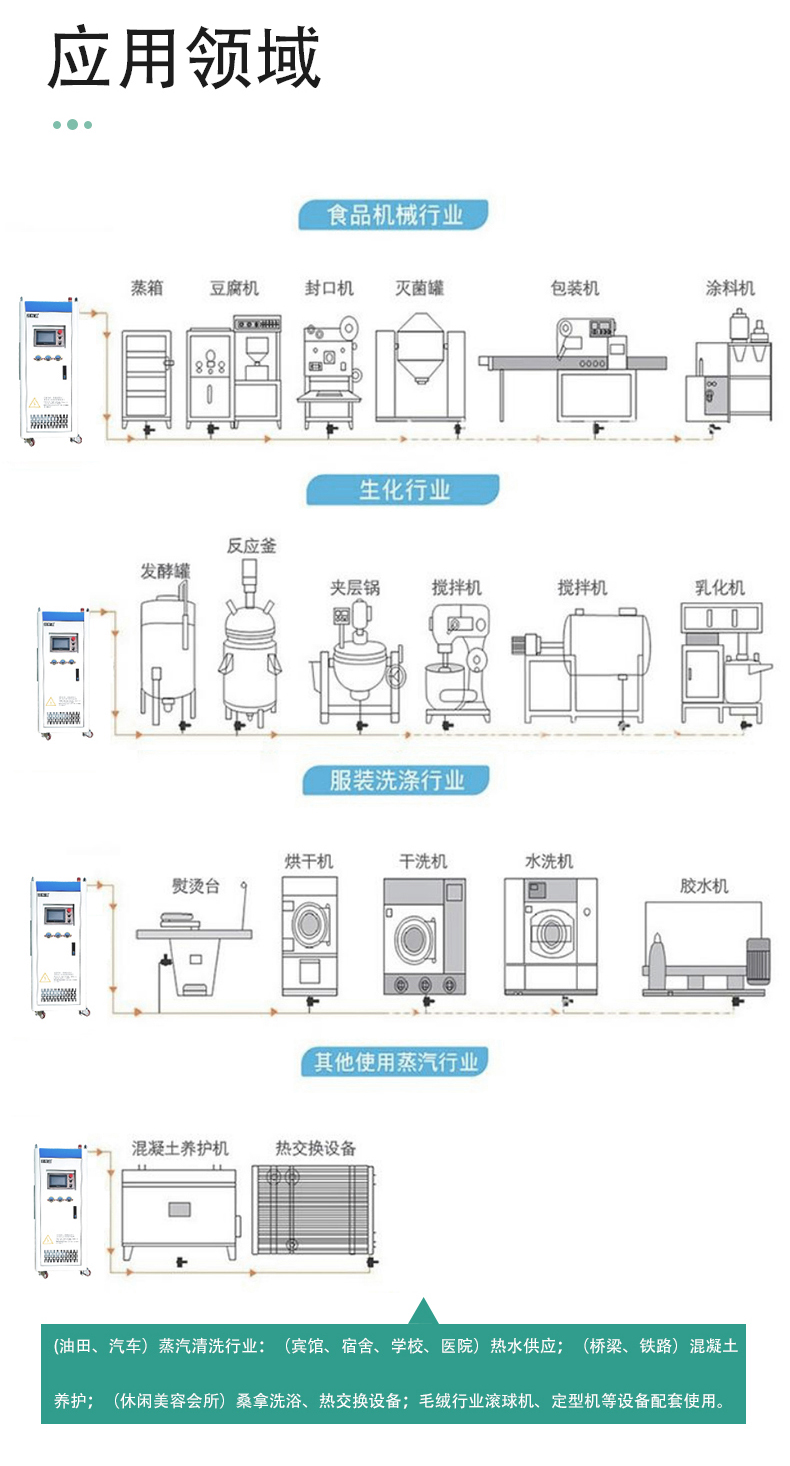 食品機(jī)械行業(yè)、生化行業(yè)、服裝洗滌行業(yè)、其他使用蒸汽行業(yè)等。